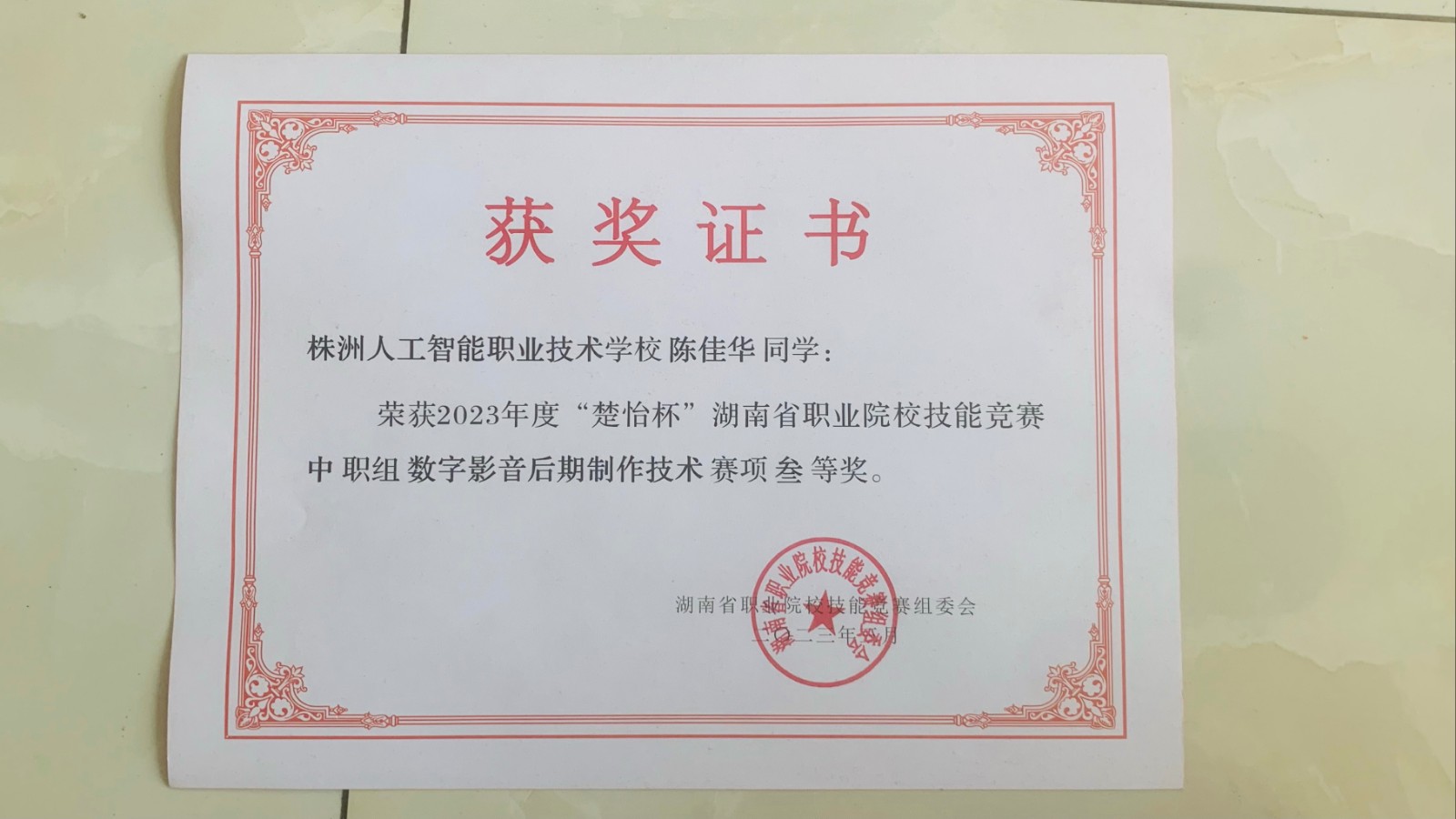 近日,2023年度“楚怡杯”湖南省职业院校技能竞赛完美收官,由我校汪璐老师指导的陈佳华同学在“数字影音”赛项中荣获省三等奖!